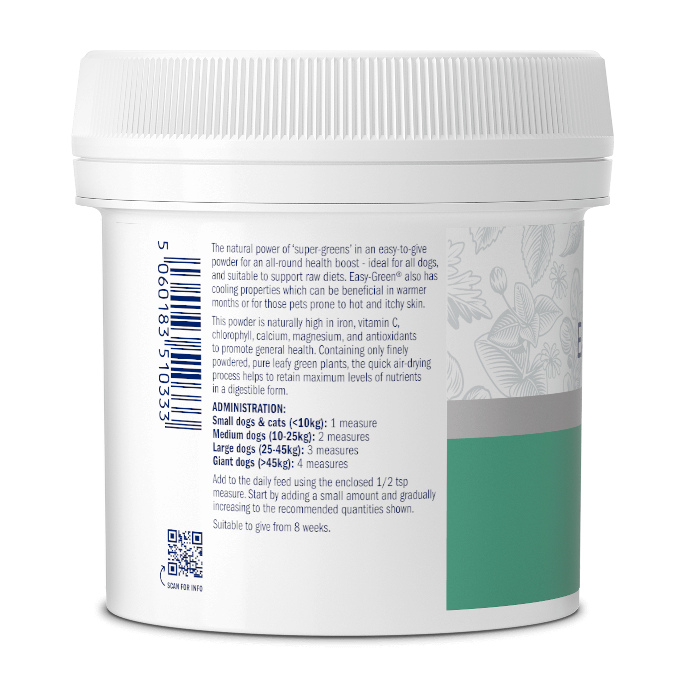 The quick air-drying process retains maximum nutrients in a digestible form to naturally boost levels of iron, vitamin C, chlorophyll, calcium, magnesium, and antioxidants (to neutralise free radicals) for all-round health. For pets with hot, itchy skin, our Easy-Green® Powder also has cooling properties.