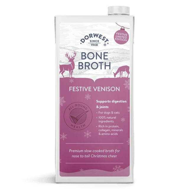 Each carton provides around 10 servings for a medium dog. Dorwest Bone Broth is designed as a daily supplement to complement your dog’s regular diet and is not intended as a meal replacement. It can also be given in larger quantities to support recovery, rehydration, or during times of illness.