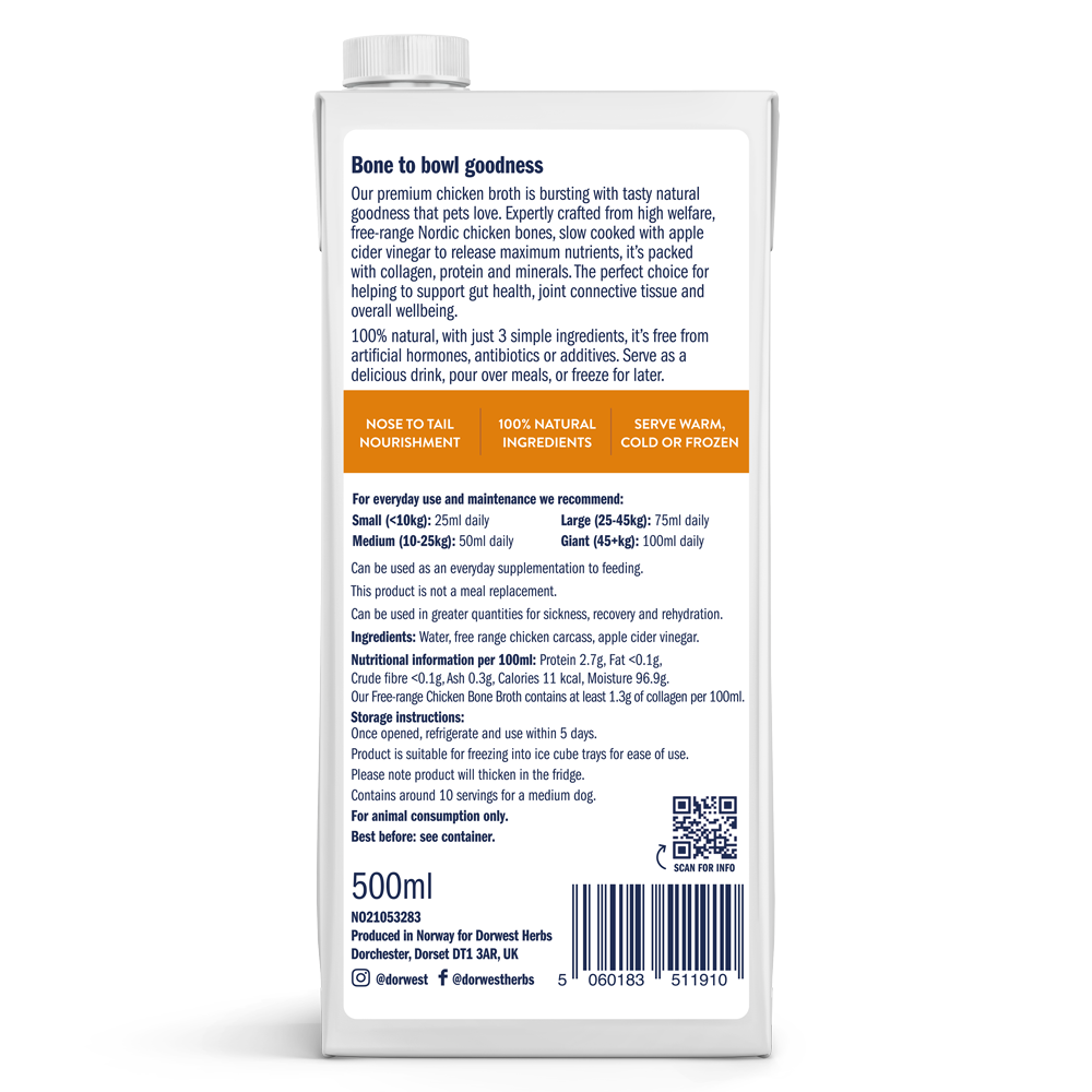 Each carton provides around 10 servings for a medium dog. Dorwest Bone Broth is designed as a daily supplement to complement your dog’s regular diet and is not intended as a meal replacement. It can also be given in larger quantities to support recovery, rehydration, or during times of illness.