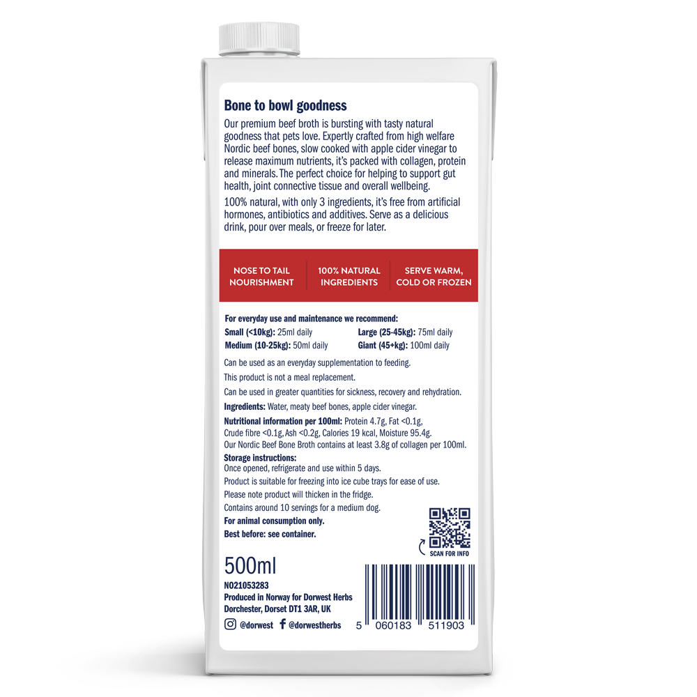 Each carton provides around 10 servings for a medium dog. Dorwest Bone Broth is designed as a daily supplement to complement your dog’s regular diet and is not intended as a meal replacement. It can also be given in larger quantities to support recovery, rehydration, or during times of illness.
