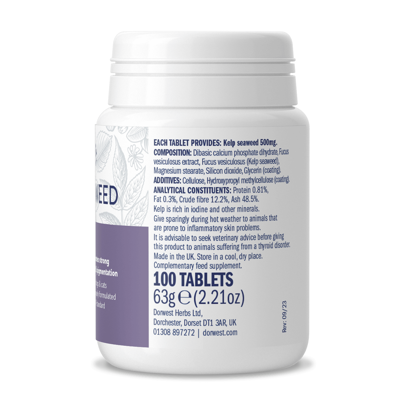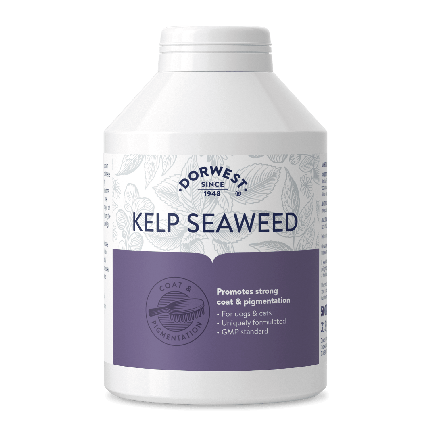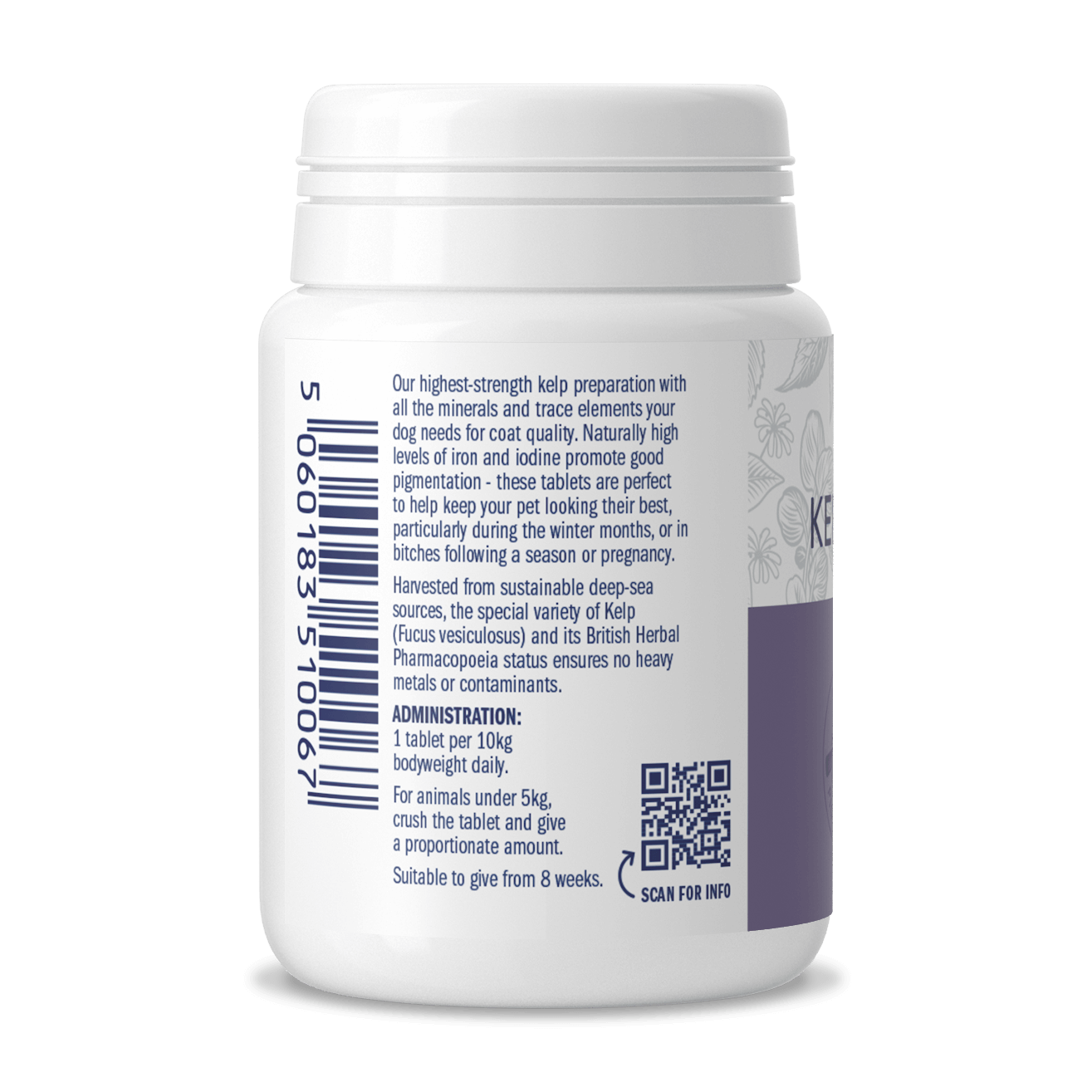 Keep your dog in peak condition by providing all of the minerals and trace elements that they need with our Kelp Seaweed Tablets. This is our highest strength kelp seaweed product, and is now double concentration for maximum effect. With naturally high levels of iron and iodine for strong coat and skin pigmentation, these tablets are perfect to help keep your pet looking their best and can also be useful for dogs with conditions that may benefit from supplementation with these specific minerals.