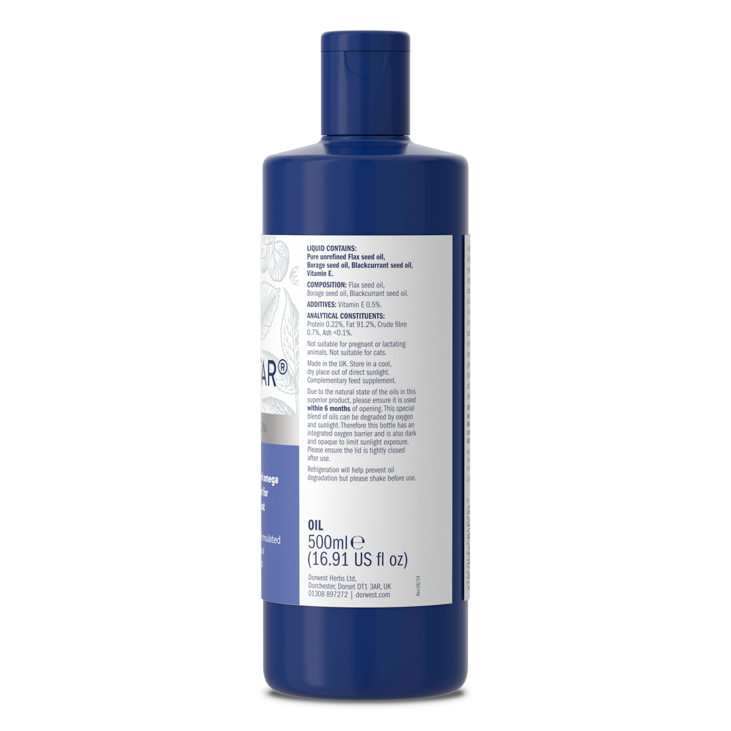 - UK grown cold pressed Flax Seed Oil provides high levels of Omega 3 & 6 oils. These are important in regulating skin renewal, keeping scurfiness under control and improving coat condition and quality.