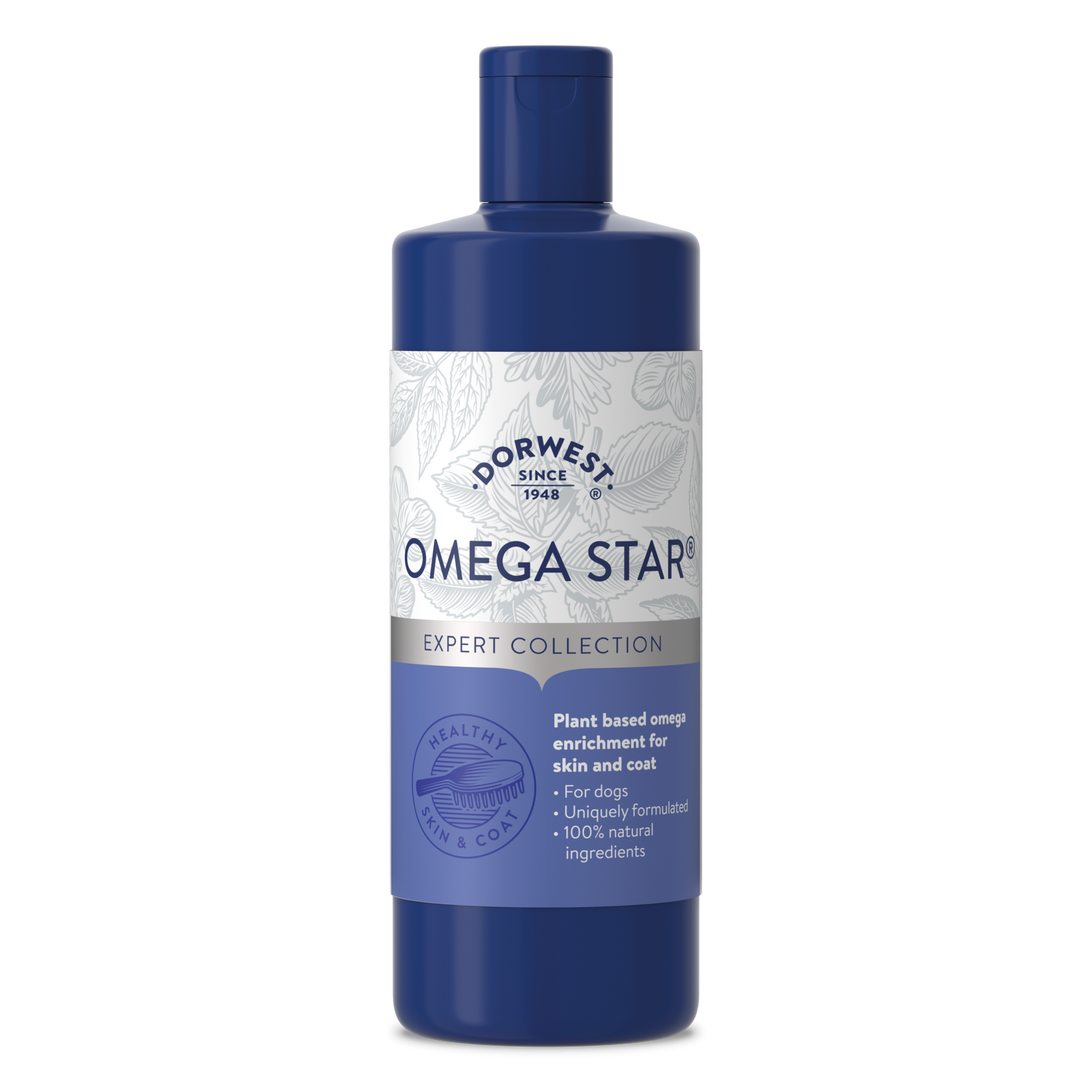 Our Omega Star® For Dogs has gained quite a reputation, containing a carefully created blend of nutritious plant oils, including flaxseed oil, blackcurrant seed oil, borage seed oils and natural vitamin E, to help nourish the skin's moisture barrier and restore coat shine and hair growth.