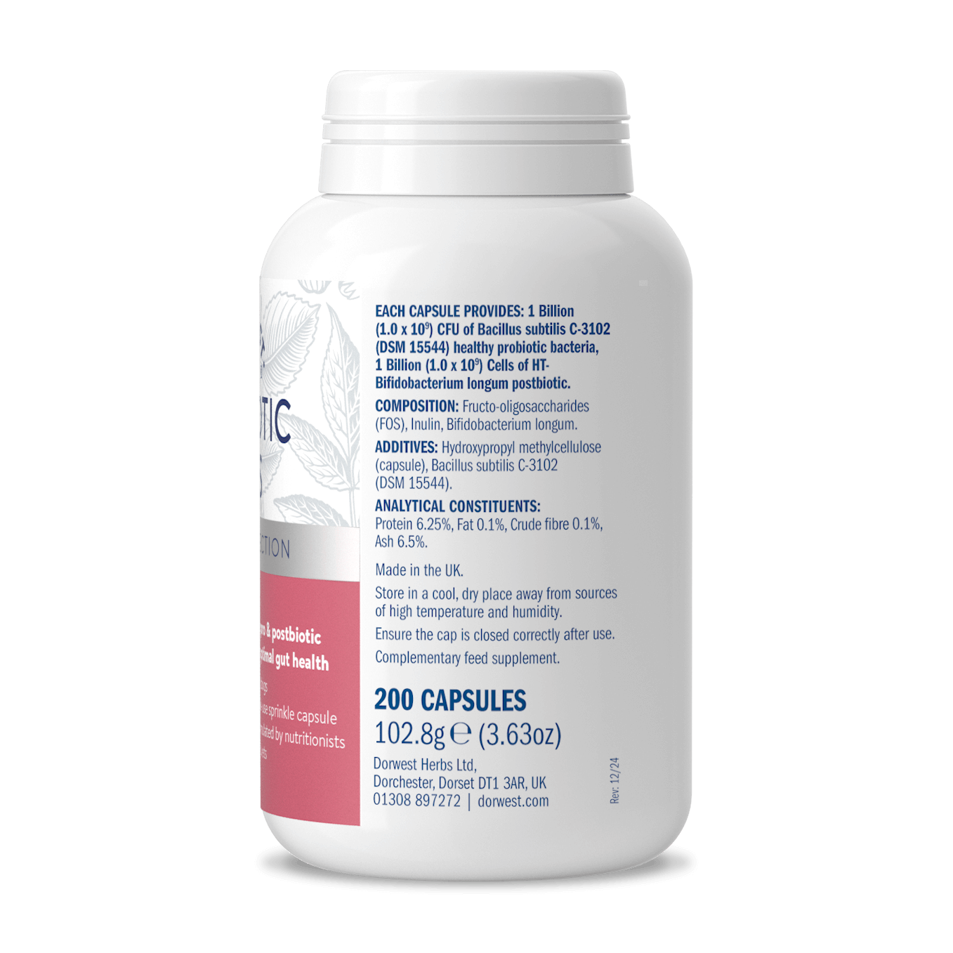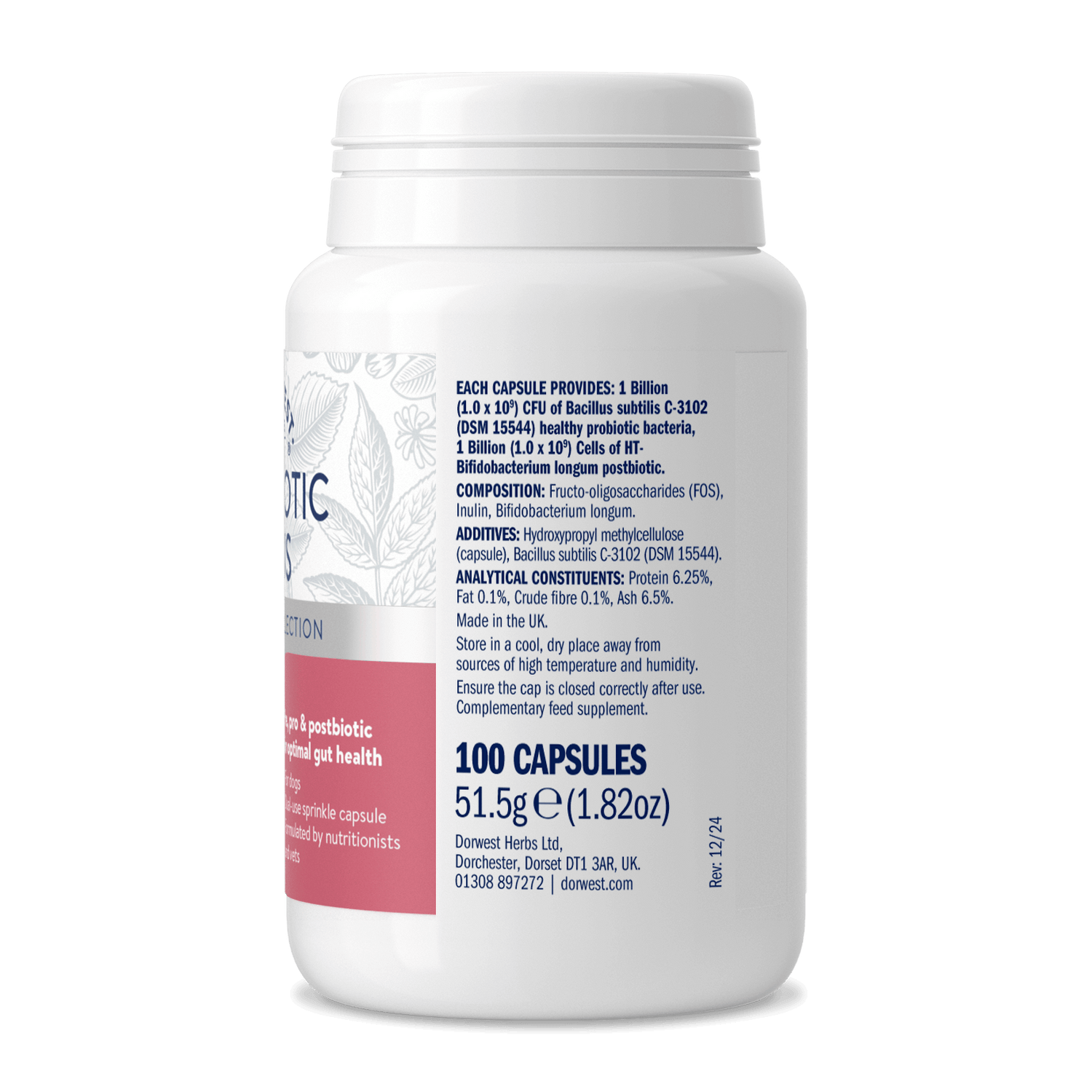 Probiotic Plus provides daily microbiome support for optimal gut health, utilising the benefits of a pre, pro and postbiotic. Formulated by nutritionists and vets for maximum benefit, it effectively promotes normal gut function by supporting the good bacteria in your dog’s gastrointestinal tract. It includes the probiotic Calsporin®, a robust soil-based organism (SBO) which has been tested for safety and efficacy.