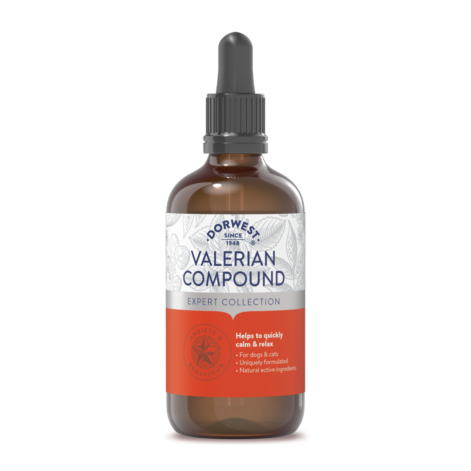 Calm your stressed, hyperactive or frightened pet quickly with our fast-acting Valerian Compound for dogs and cats. Containing pure extracts of three herbs in liquid form, it acts within just 30 minutes, with effects lasting for up to two hours. It can be dropped straight into the mouth, given on food or sprinkled onto your pet's bedding to help make any event instantly less stressful. It's non-drowsy and even our fussy feline friends love the smell, making it super easy to use.