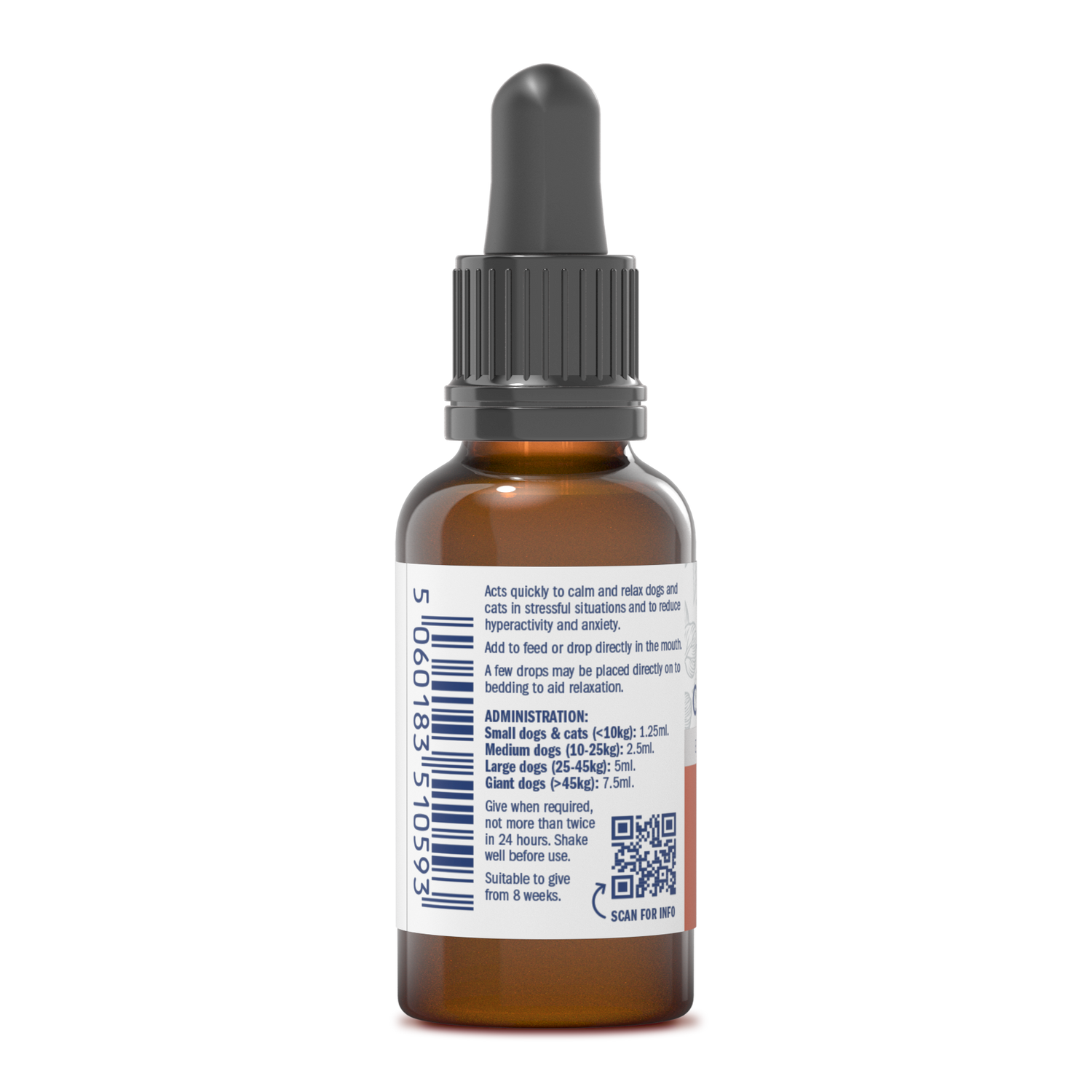 Frightened, anxious, hyperactive and stressed animals can be calmed quickly using this easy to give liquid. Dropped into the mouth, given on food or even just a few drops sprinkled on a pet's bedding can result in a more amenable pet, so visits to the vet, travelling or moving house instantly become less stressful situations. Cats particularly love the smell of Valerian Compound, so administration really couldn't be simpler.