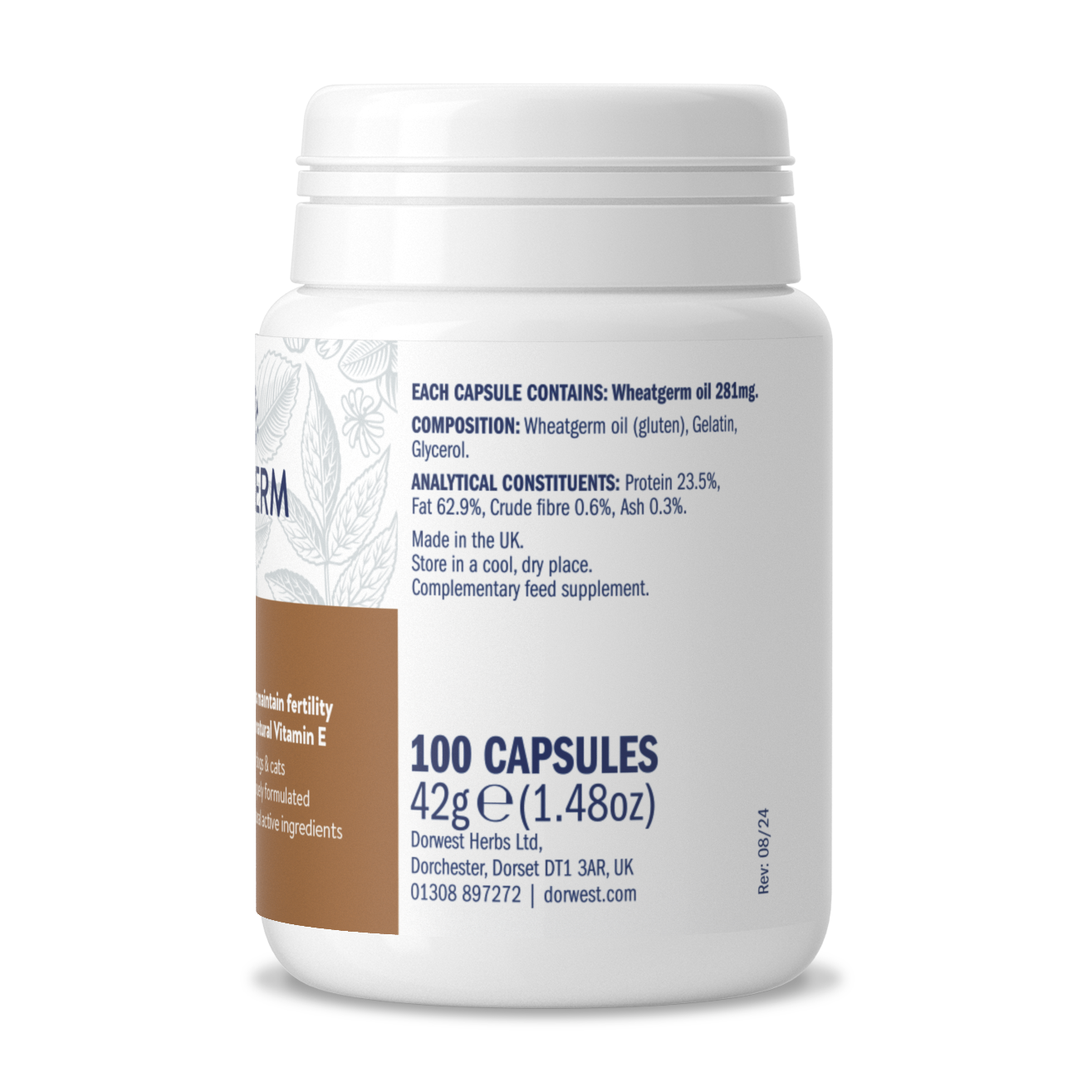 Wheatgerm oil is naturally rich in vitamin E, a potent antioxidant which neutralises free-radicals. Free radicals are produced as a by-product of everyday cell functions, so a plentiful supply of vitamin E is beneficial to keep them in check. Our Wheatgerm Oil Capsules can be given year-round to help promote a healthy skin and coat and are also used to maintain fertility and a healthy reproductive system in both male and female pets.